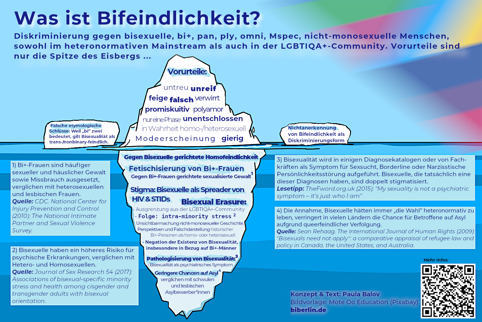 Dieses Plakat zum Thema Bi+ Feindlichkeit wurde erstmals 2020 erstellt und 2024 leicht überarbeitet. Gestaltet wurde es von Paula Balov für BiBerlin e. V., die das Material auch auf ihrem eigenen Blog Herzbrille veröffentlichte.